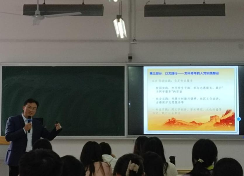 人文与社会科学学院党委副书记管永刚从“文科视角下的入党之路”切入,借外交案例阐释国家强大的意义,围绕党的初心使命明确文科青年担当,指导学生从思想、行动、社会三方面实践入党追求。