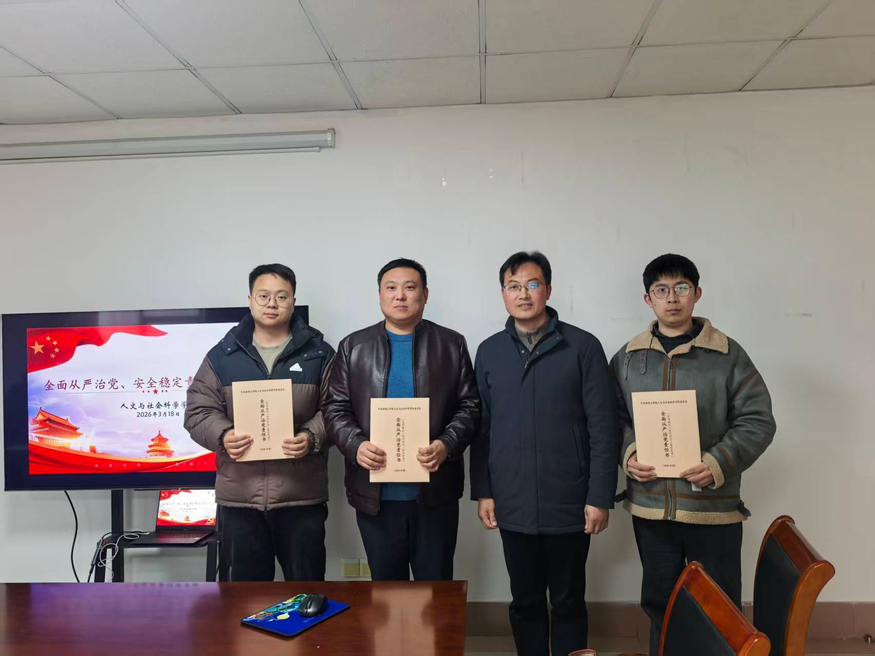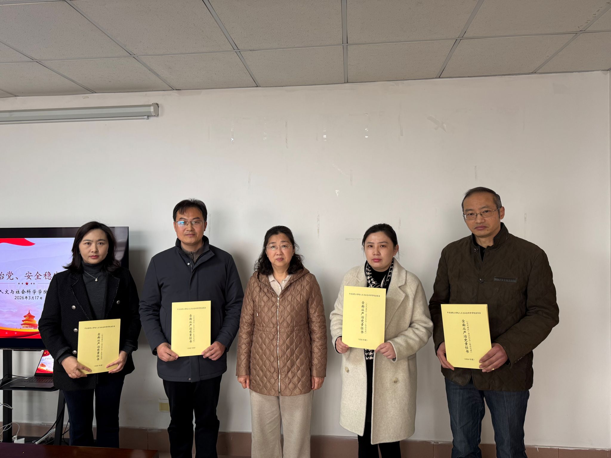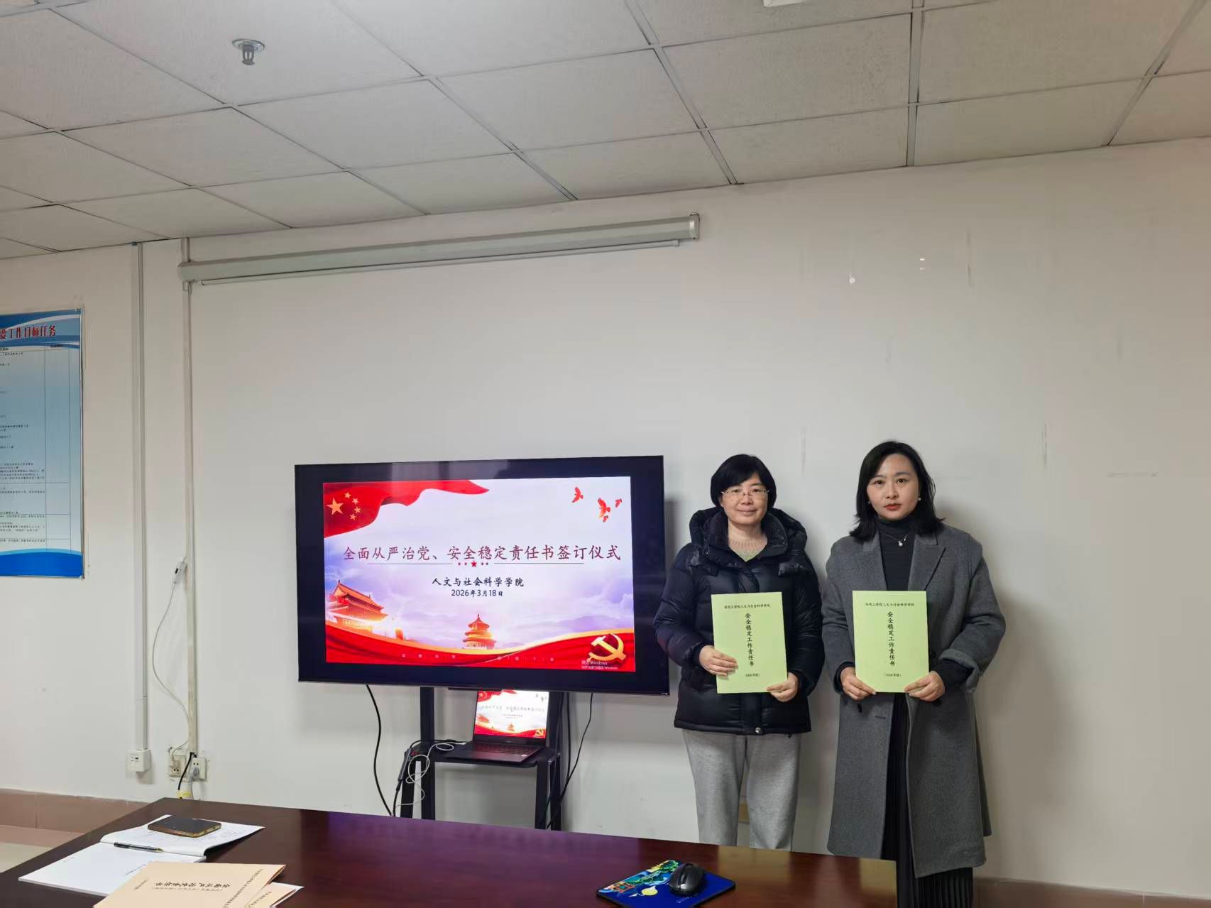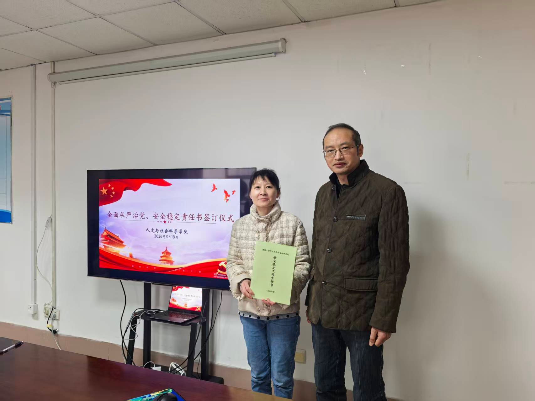 在与会人员的共同见证下,会议举行了责任书签订仪式。学院党政一把手与班子成员逐一签订了《人文与社会科学学院2026年度全面从严治党责任书》、《人文与社会科学学院2026年度安全稳定工作责任书》,明确了班子成员在分管领域内管党治党、党风廉政建设的领导责任,细化了履职清单和考核标准。随后,学院领导干部分别与所分管岗位负责人签订了《人文与社会科学学院2026年度安全稳定工作责任书》和《人文与社会科学学院2026年度全面从严治党责任书》,将责任层层分解、精准传导,落实到岗、具体到人,形成了“党委统筹、班子引领、全员参与、层层落实”的责任体系。