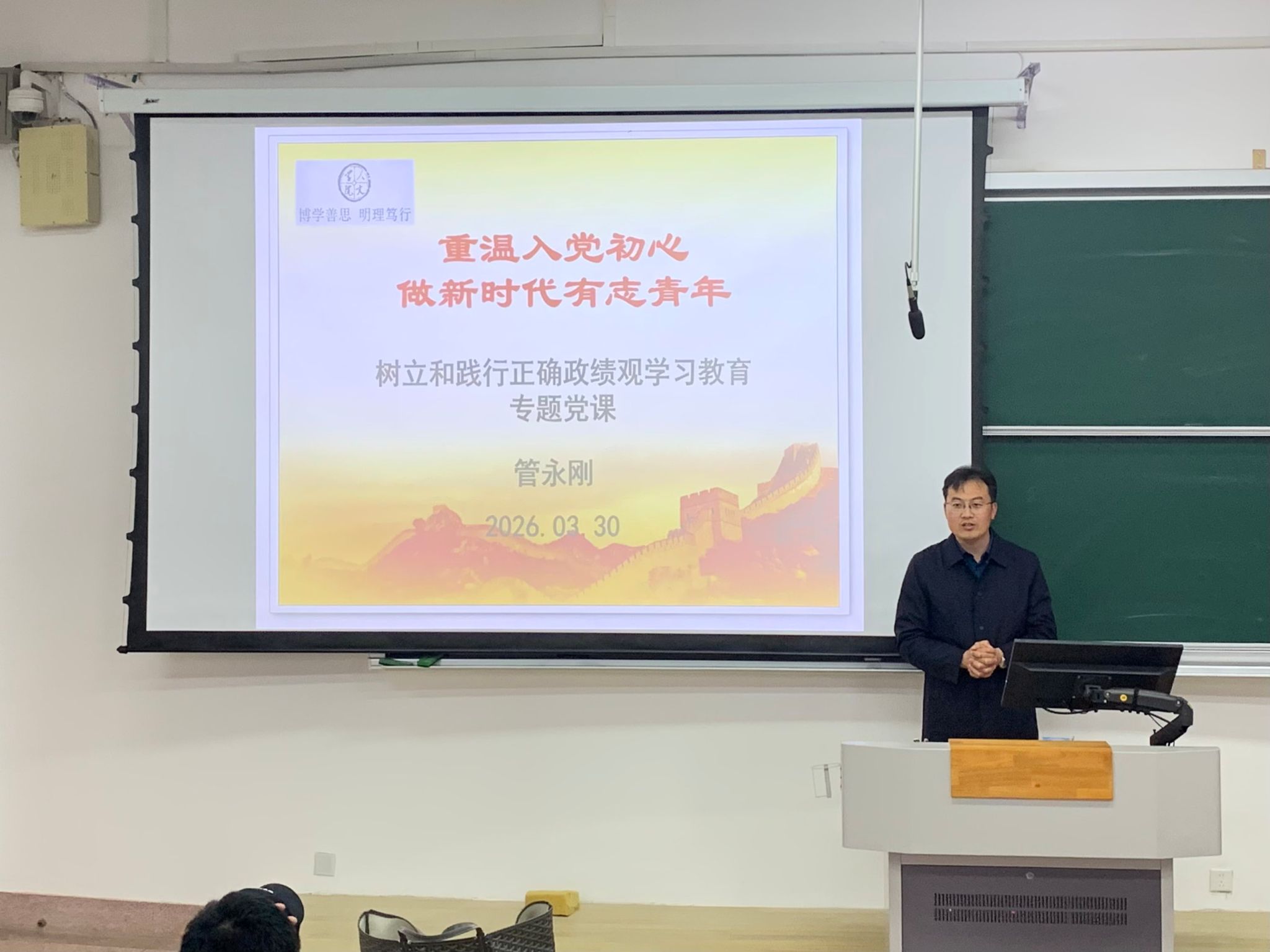 学院党委副书记、副院长管永刚以“重温入党初心,做新时代有志青年”为主题开展专题党课,围绕“我为什么要加入中国共产党”核心问题,阐释了入党的初心使命与全心全意为人民服务的根本宗旨,以徐川、黄文秀等先进典型为引领,回溯党的奋斗历程,明确主题教育“学思想、强党性、重实践、建新功”的总要求与“科学决策、民主依法、真抓实干、务求实效”的根本任务,为大学生入党积极分子厘清思想认知、校准行动方向,引导青年以榜样为标杆,在学习与实践中锤炼奉献、自律、吃苦精神,将个人理想融入党和国家事业,成长为德智体美劳全面发展的社会主义建设者和接班人。