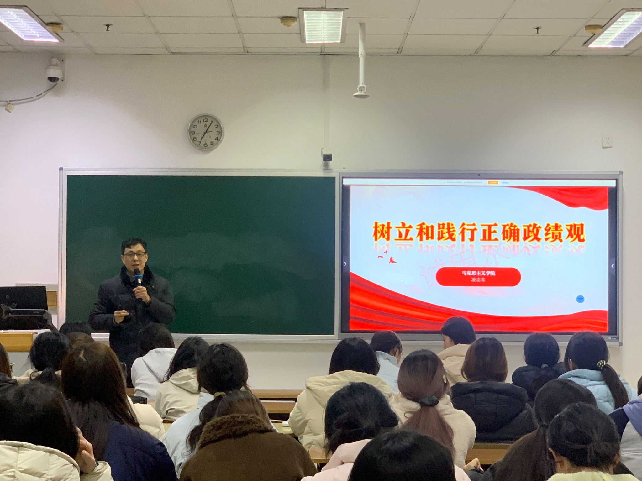 马克思主义学院凌志东老师以“树立和践行正确政绩观”为主题开展党课教学,围绕正确政绩观的丰富内涵与实践要求,结合理论学习与典型案例,为学员解读新时代青年应有的责任担当与价值追求。通过阐释“为民造福是最大政绩”的深刻意义,督促学员坚定理想信念,厚植为民情怀,做到实事求是、真抓实干,以过硬作风和实际行动践行初心使命。