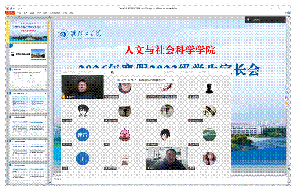 为进一步深化家校联动,明确大三阶段学生发展方向,从2月3日开始,人文与社会科学学院2023级辅导员管永刚分班级陆续在腾讯会议上线上召开2023级学生家长会,与家长们围绕防范网络电信诈骗、学业规划、考研准备、亲子关系等内容展开深入交流。