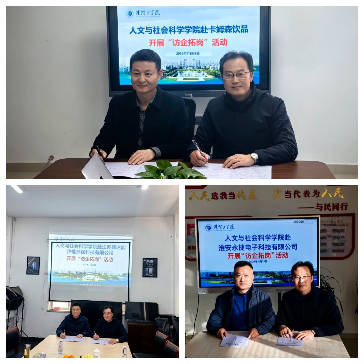 为深入贯彻落实党中央、国务院关于 “稳就业”“保就业” 的决策部署,进一步拓宽毕业生就业渠道,深化校企协同育人机制,11月28日,人文与社会科学学院党委书记田萍、副书记管永刚一行,先后走访了铭扬工程设计集团有限公司淮安分公司、江苏鑫达能热能环保科技有限公司、淮安永捷电子科技有限公司、江苏卡姆森饮品有限公司、江苏东煦电子科技有限公司、江苏世田谷生物科技有限公司等多家行业标杆企业及重点用人单位,以实地调研、座谈交流等形式,搭建校企合作新桥梁,为毕业生高质量就业注入强劲动力。