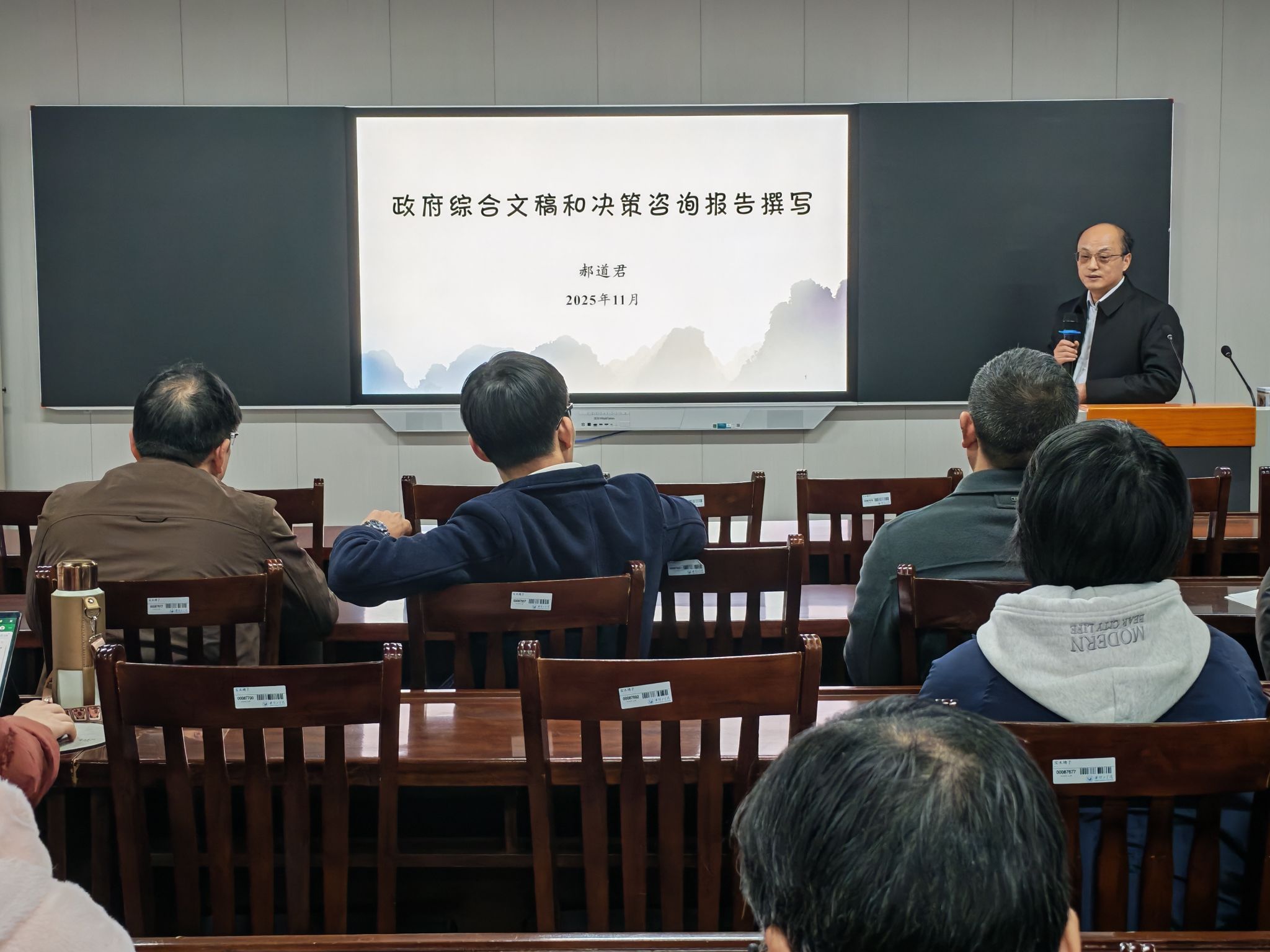 1128日下午,淮安市政府副秘书长、研究室主任郝道君应邀来我校作题为《政府综合文稿与决策咨询报告撰写》的专题讲座。讲座由人文与社会科学学院院长汪倩倩教授主持,人文与社会科学学院全体教师以及部分学生代表参加了讲座。